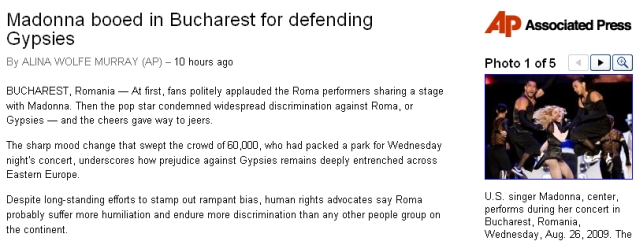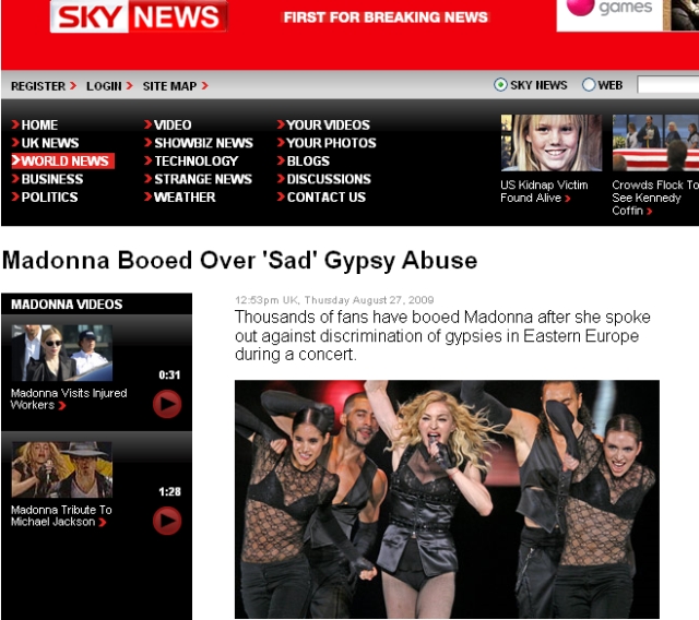 Şi jurnaliştii de la postul britanic de ştiri Sky News scriu că Madonna a încercat, în timpul unei pauze a spectacolului ei din România, să vorbească despre romii din Europa de Est care suferă din cauza discriminării. Mesajul ei nu a fost bine primit de spectatori, mai spun jurnaliştii.