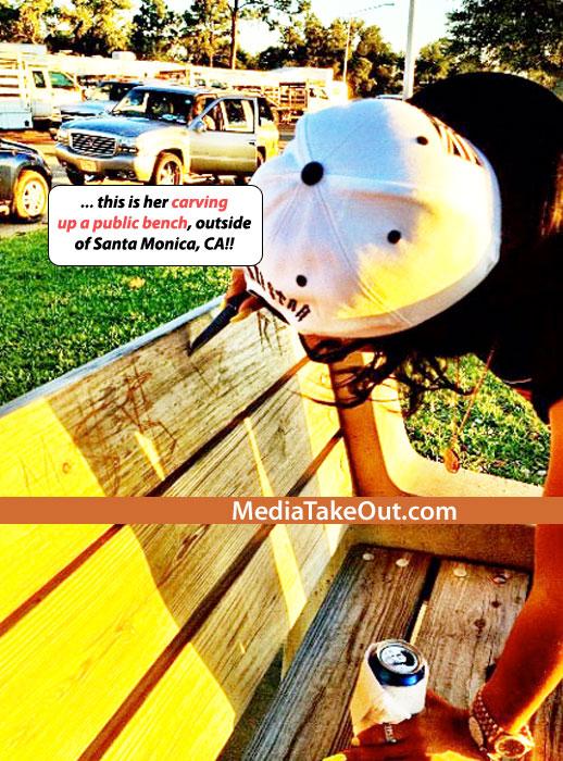 Aşadar, Rihanna s-ar putea să o încurce. Diva a postat pe internet o fotografie care ar putea să îi facă mult rău. S-a pozat în timp ce îşi cioplea numele pe o bancă, acest lucru fiind un delict, pedepsit cu un an de închisoare cu executare.