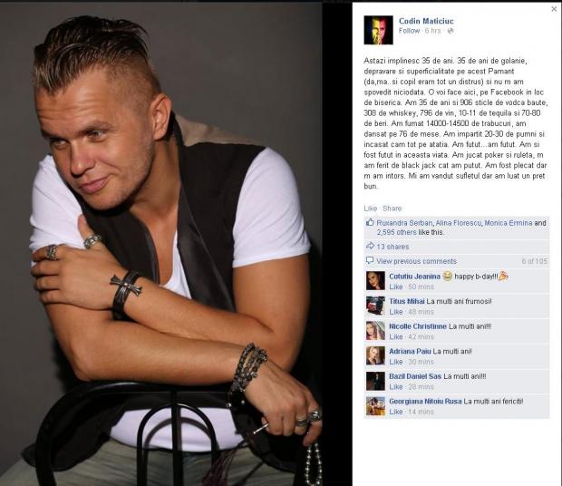 "Astazi implinesc 35 de ani. 35 de ani de golanie, depravare si superficialitate pe acest Pamant (da,ma..si copil eram tot un distrus) si nu m-am spovedit niciodata. O voi face aici, pe Facebook in loc de biserica. Am 35 de ani si 906 sticle de vodca baute, 308 de whiskey, 796 de vin, 10-11 de tequila si 70-80 de beri. Am fumat 14000-14500 de trabucuri, am dansat pe 76 de mese. Am impartit 20-30 de pumni si incasat cam tot pe atatia. (...) Am jucat poker si ruleta, m am ferit de black jack cat am putut. Am fost plecat dar m am intors. Mi-am vandut sufletul dar am luat un pret bun."