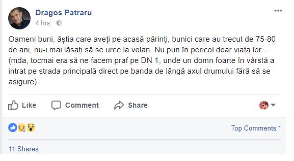 (mda, tocmai era să ne facem praf pe DN 1, unde un domn foarte în vârstă a intrat pe strada principală direct pe banda de lângă axul drumului fără să se asigure)”, a scris Dragoș Pătraru.