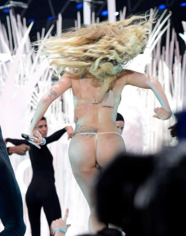 Cântăreaţa purta un sutien minuscul, iar pe post de cupe erau două scoici. Când vine vorba de partea de jos, situaţia se complică puţin. S-a asigurat că nu i se vede nimic în faţă, dar pe post de chiloţi, în partea din spate avea o aţă.