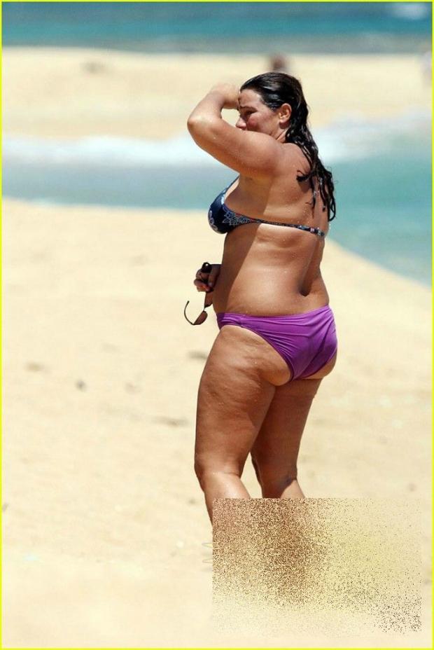 Imaginile surprinse la plajă arată că doamna Brosnan nu se sfieşte să îşi arate trupul durduliu chiar şi fără haine: