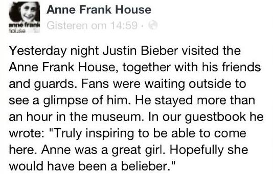 Bieber nu a găsit altceva mai bun de scris în cartea de aur a muzeului decât că Anne Frank s-ar fi putut număra... printre fanii săi.