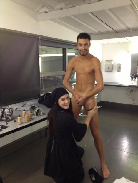 De asemenea, în fotografie apare make-up artistul Roisin Donaghy, înghenuncheată în faţa lui în timp ce îi aplica machiajul.