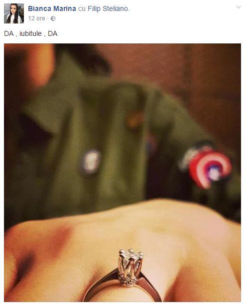 Steliano Filip a cerut-o de soție pe iubita sa Bianca Marina Arbănaș, iar ea a acceptat pe loc. Anunțul a fost făcut de cei doi pe Facebook.