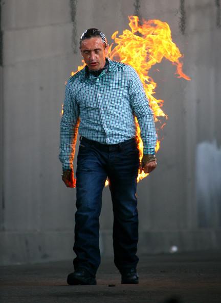 Acesta a fost uns cu o vaselină rezistentă la foc pentru a-i proteja faţa în timp ce focul ardea.