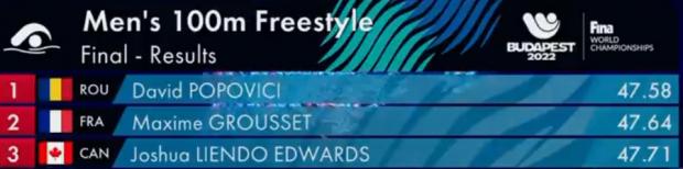 Puștiul minune al înotului românesc a concurat pe culoarul al 4-lea, cel al favoritului. E același culoar pe care David a cucerit luni prima medalie din istoria natației masculine din România, în proba de 200 de metri liber! 47.58 a fost timpul scos de David Popovici.