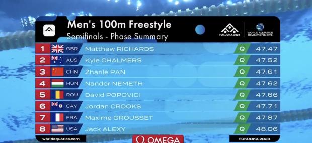 David Popovici a concurat pentru finala probei de 100 de metri liber, în prima semifinală, pe culoarul 3, alături de Nandor Nemeth (Ungaria), Dylan Carter (Trinidad Tobago), Jack Alexy (SUA), Jordan Crooks (Insulele Cayman), Maxime Grousset (Franța), Sunwoo Hwang (Coreea de Sud), Guilherme Santos (Brazilia).