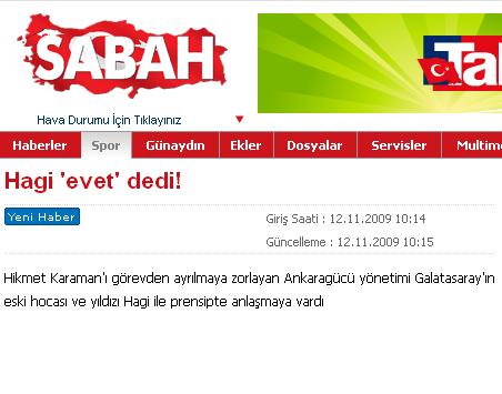 "Conducerea galben-albastră îl forţează pe Hikmet Karaman să renunţe la funcţie şi a gãsit în România un înlocuitor. Oficialii clubului Ankaragucu au ajuns la un acord de principiu cu fostul fotbalist legendar al echipei Galatasaray, Hagi", notează Sabah.