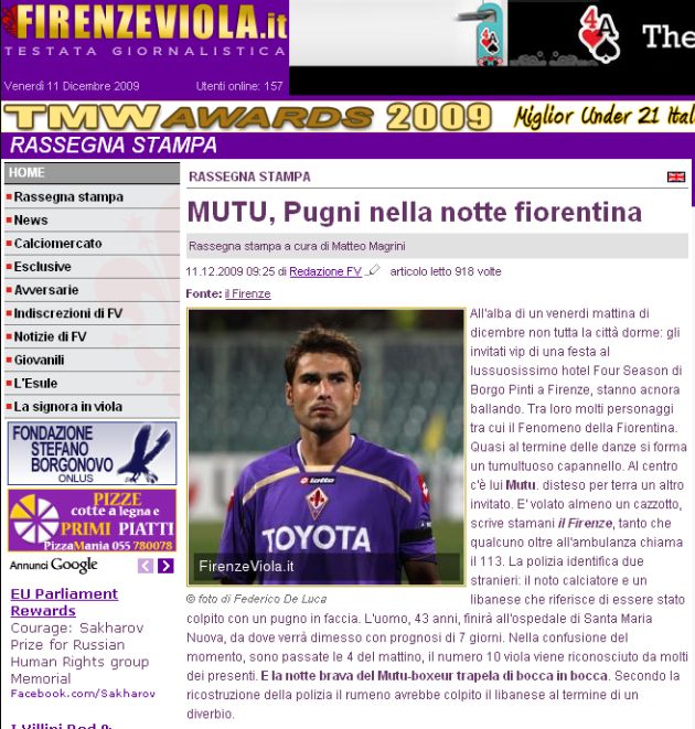 Potrivit presei italiene, Mutu ar fi luat parte la un scandal, în timpul unei petreceri care a avut loc joi noapte. Martorii incidentului povestesc că Mutu s-ar fi aflat chiar lângă libanezul întins la pământ. Poliţia şi ambulanţa au sosit imediat la clubul respectiv.