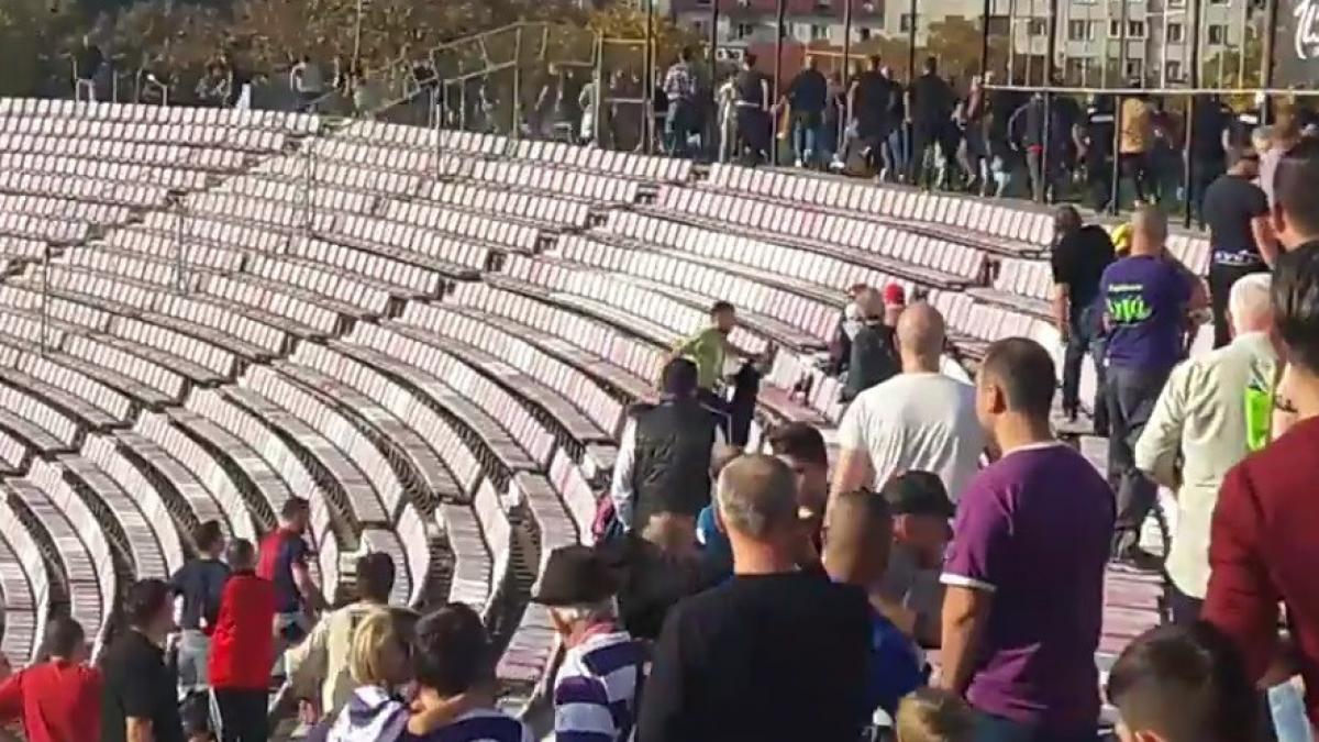 Polițistii nu s-au lasat mai prejos si au alergat spre rivali, astfel ca s-au impartit pumni pe stadionul Dan Paltinisanu.