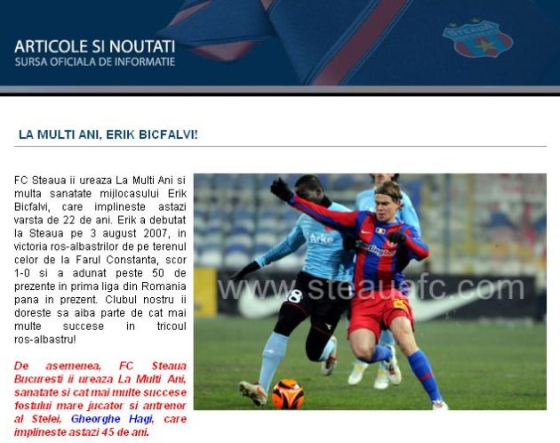 Pentru alţii, însă, prezentul este mai important decât trecutul de legendă. Clubul Steaua Bucureşti îi urează şi el "la mulţi ani, sănătate şi cât mai multe succese fostului mare jucător şi antrenor al Stelei", însă mesajul clubului patronat de Gigi Becali este ascuns într-o ştire dedicată zilei de naştere a lui Erik Bicfalvi, un jucător mult mai reprezentativ pentru Steaua... actuală.
