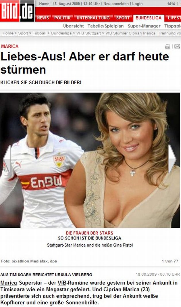 Cotidianul german i-a dedicat un articol şi atacantului Ciprian Marica sau mai bine zis fostei lui iubite, Gina (nu Jane) Pistol. Marica este în viziunea Bild un ?superstar?. ?Atacantul român a fost primit ca un superstar la Timişoara?, au mai scris germanii.