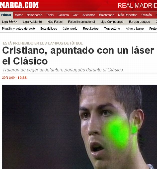 Conform cotidianului spaniol Marca, portughezul Cristiano Ronaldo se pregătea să execute o lovitură liberă în momentul în care a fost vizat cu laserul de mai mulţi fani catalani. În repriza a doua a venit rândul lui Pepe să fie deranjat de lumina verde a unui laser, în timp ce era căzut la pământ după un fault al lui Thierry Henry.