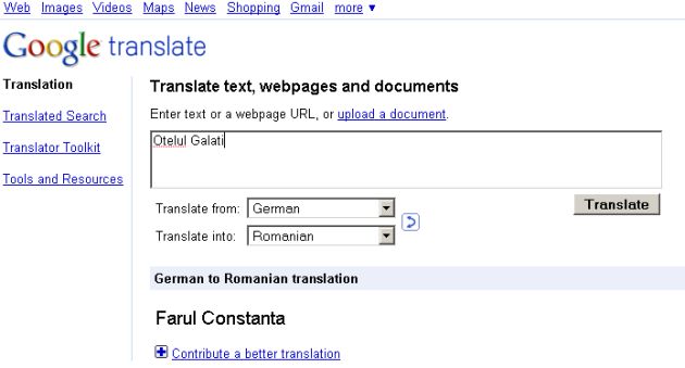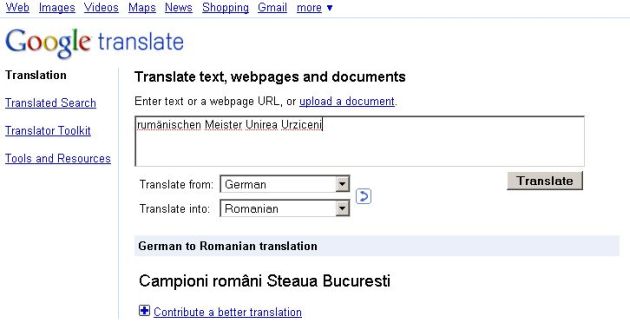 În materie de fotbal, atunci când veţi încerca să traduceţi "Rumanischen Meister Unirea Urziceni" veţi avea surpriza să aflaţi că Steaua Bucureşti este campioana României. Google Translate recunoaşte Unirea Urziceni ca fiind un club de sine stătător, însă când vine vorba de alăturarea numelui echipei de cuvintele "campioana României", ialomiţenii se dau de trei ori peste cap şi devin stelişti.