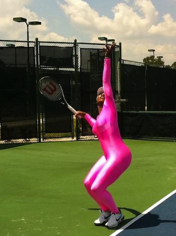 Sportiva a intrat pe teren cu o rachetă în mână şi purtând un costum mulat roz închis, deşi ea nu anunţase că ar fi văzut recent "Pretty in Pink" sau că ar fi citit "Catwoman".