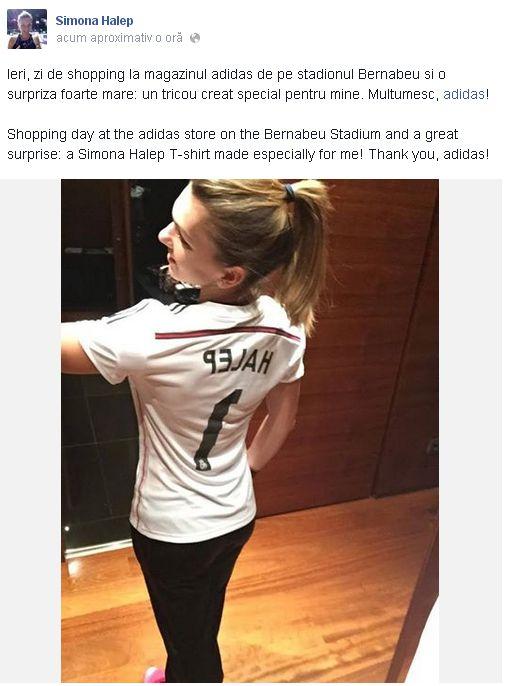 "Zi de shopping la magazinul de pe stadionul Bernabeu şi o surpriză foarte mare: un tricou creat special pentru mine", a scris Simona pe contul ei de Facebook, unde a şi postat o fotografie îmbrăcată cu tricoul respectiv.