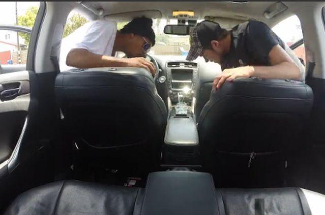 Însă surpriză, după ce sunt lăsaţi să se "servească" cu ceea ce le pofteşte inima, cineva scoate capul... din portbagaj. Moment în care "curajoşii" o rup la fugă.
