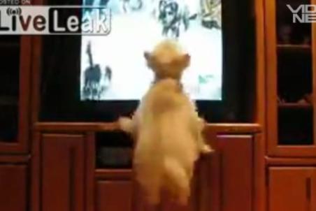 Cum animalele de pe micul ecran par agresive şi tot mai multe, căţeluşul începe să latre şi sare cu lăbuţele pe mobilă, în încercarea de a ajunge la semenii săi.